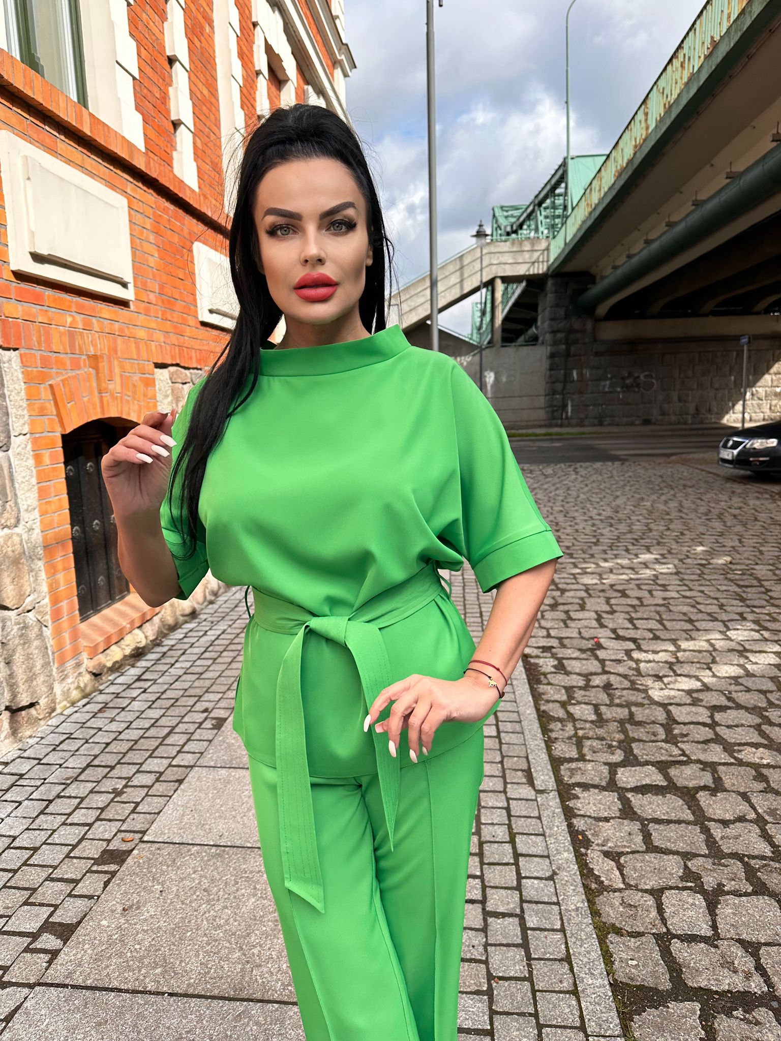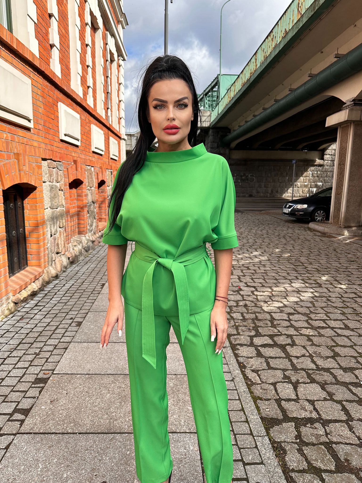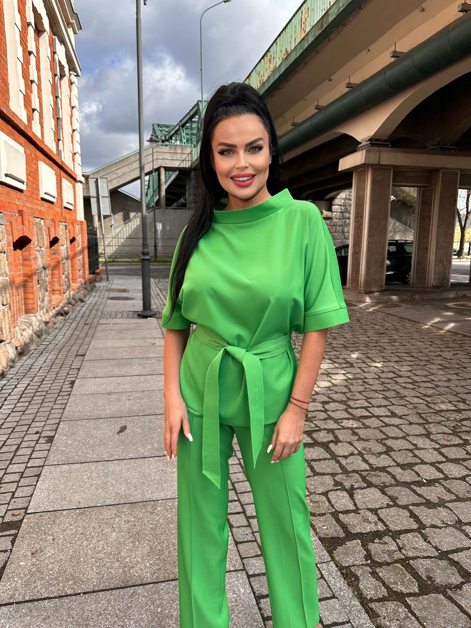 Komplet  RITA zaprojektowany został z myślą o kobietach ceniących sobie wygodę. Bluzka luźna , pasek podkreśla  sylwetkę, krój sprawiają, że to idealny model do wyjątkowych i codziennych stylizacji. Spodnie posiadają w pasie gumkę co sprawia ,że dopasowują się do każdej sylwetki